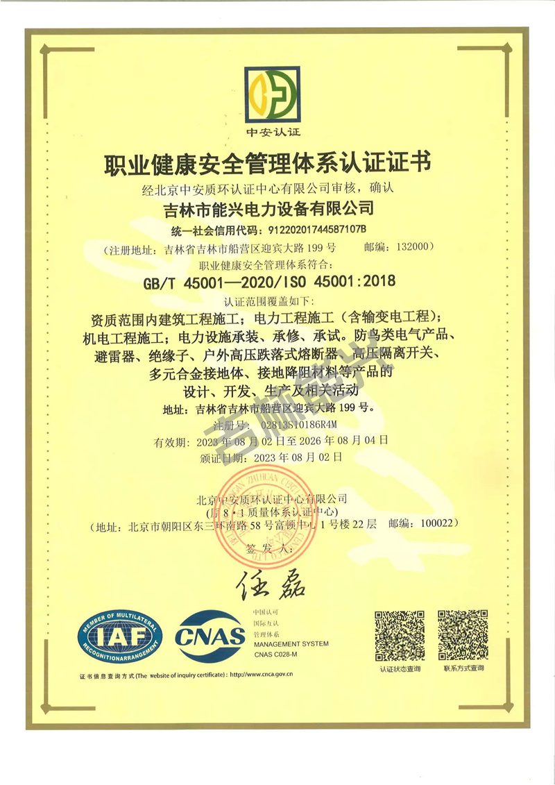 职业健康安全管理体系认证证书